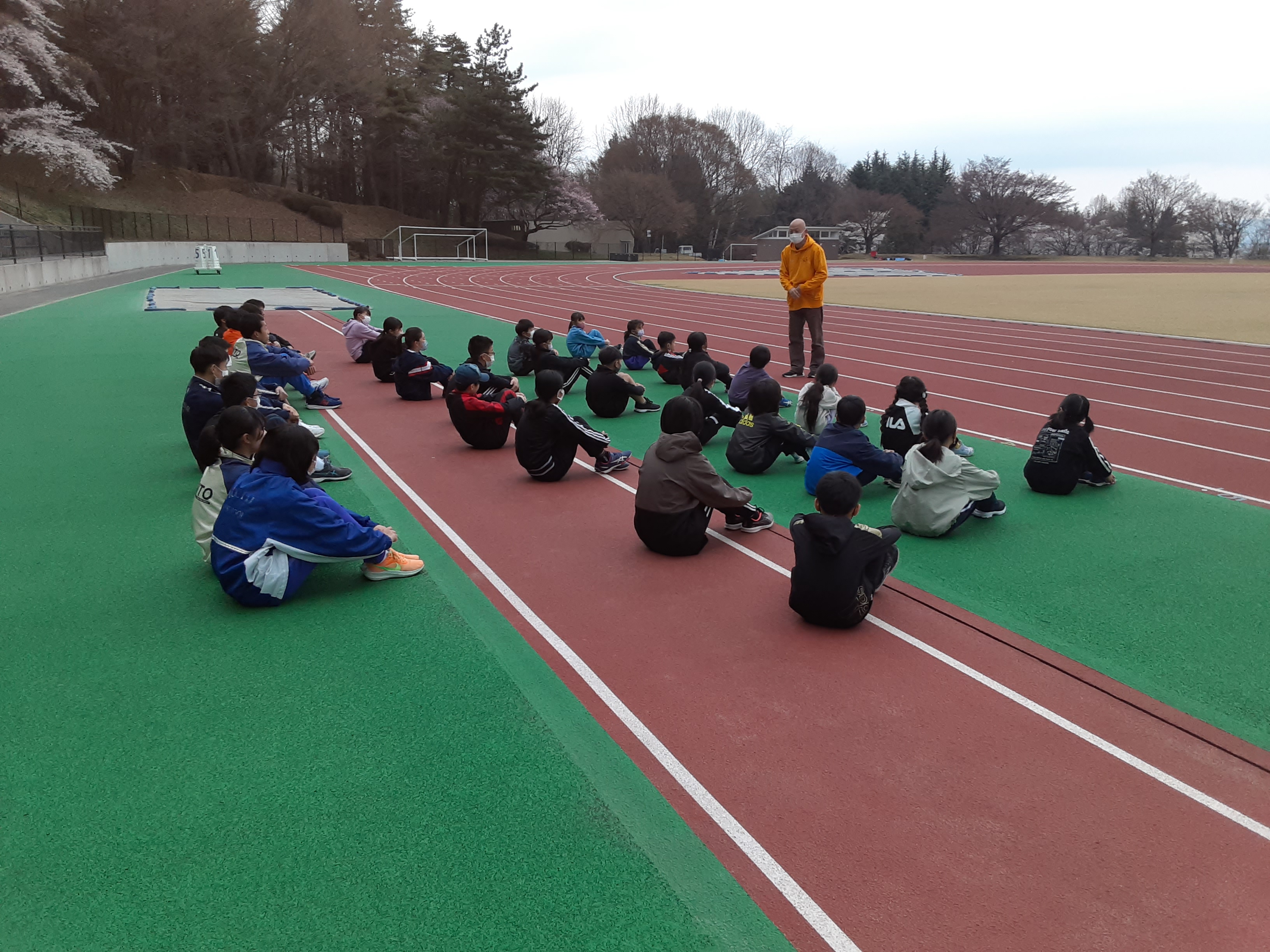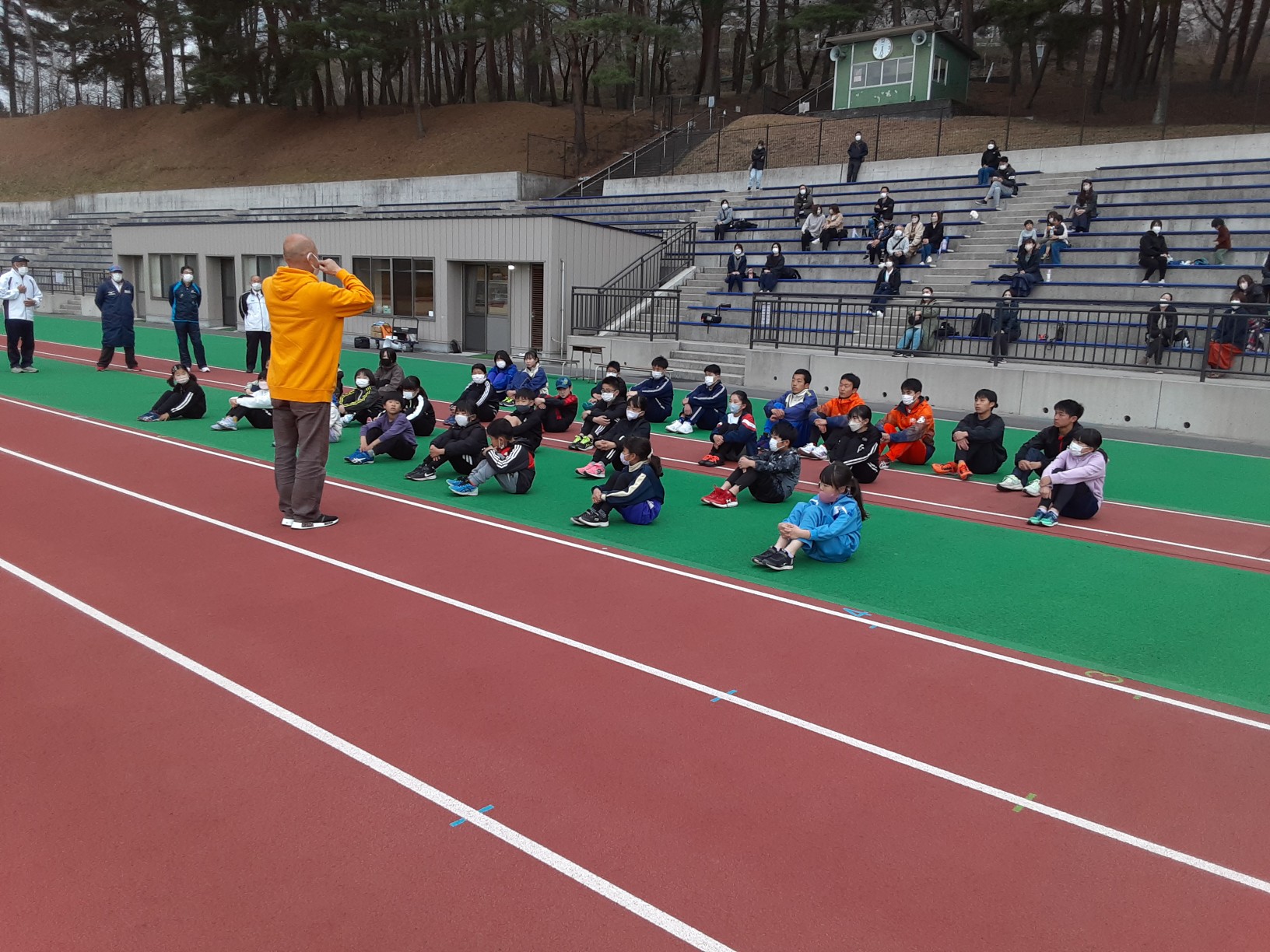 練習終了後、連絡事項があります。迎えの保護者の方は競技場スタンドまで来てください。 |